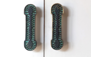 Responding to a market need for well-designed, contemporary cabinet hardware, Jerome designs the Antico line of hand-cast solid brass knobs and pulls, some with inlays, and has them produced in Italy.