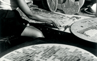 Inspired by a contemporary mosaic panel in a San Francisco art exhibition, Evelyn works with Jerome to design and produce mosaic panels and tables.