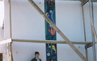 Evelyn designs a two-story mosaic mural, Fantasy Landscape, for the exterior of an apartment building on Kiowa Avenue in West Los Angeles. It is registered with the Los Angeles Mural Conservancy.