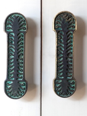 Responding to a market need for well-designed, contemporary cabinet hardware, Jerome designs the Antico line of hand-cast solid brass knobs and pulls, some with inlays, and has them produced in Italy.